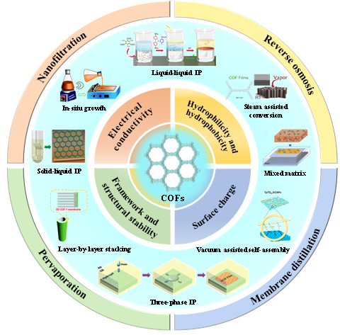 因此,本文综述了近年来关于COFs和COF膜的研究进展,包含其先进的制备策略和在膜分离领域中的应用。论文首先总结了COFs材料的合成方法,包含溶剂热合成法、离子热合成法、机械化学法、界面聚合法和原位表面转换法,探讨了COFs的关键特性,包括导电性、亲疏水性、表面电荷和结构稳定性,以期为高性能COF膜的构建提供参考。随后全面系统地介绍了COF膜的制备策略,包括原位生长法、界面聚合法、层层剥离法、真空辅助自组装法、基材辅助溶剂热法、蒸汽转换法和连续流法。最后,讨论了COF膜在海水淡化和水处理领域的研究现状和进展,分析了高性能COF膜的开发及其实际应用所面临的挑战,指出了未来的努力方向。