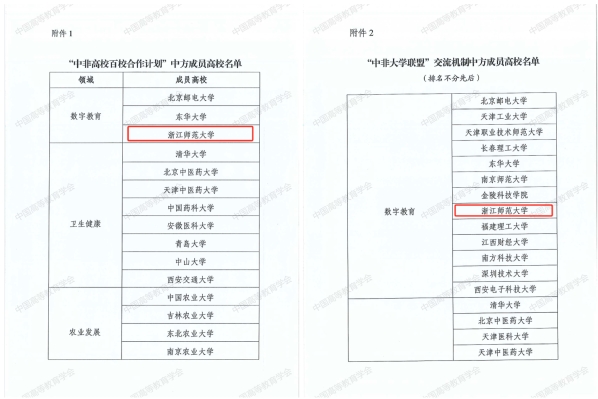 “中非高校百校合作计划”中方成员高校覆盖数字教育、卫生健康、农业发展等10个领域。浙师以非洲教育为基础入选“数字教育”领域,本领域包括北京邮电大学、东华大学和浙江师范大学3所高校。此外,在“中非大学联盟”交流机制中方成员高校中,浙师入选“数字教育” 领域。