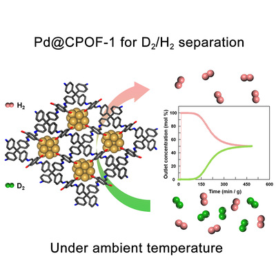 同位素是指具有相同原子序数但质量数(或中子数)不同的核素。同位素的分离技术在核燃料循环、核废料处理等方面具有重要应用,然而由于同位素之间的分子内结构和分子间相互作用具有极大的相似性,因此分离同位素非常困难。氘(D)作为氢(H)的重要稳定同位素,也称为“重氢”,高纯氘在武器制造、工业生产与科学研究中具有不可替代的作用,可广泛应用于非放射性同位素跟踪、中子散射和核聚变等,是国防科技和核能工业的重要战略物资。目前,工业上的D2/H2分离技术面临能耗过高和分离步骤繁复等诸多挑战。例如,在工业应用中采用钯膜进行分离时需要在高温(400℃)条件下进行多次分离操作,消耗大量能源,同时其单次分离效率极低(分离系数为1.3)。此外,单热NH3/H2交换法等其他分离方法不仅能量消耗大,还会伴随着有毒和腐蚀性物质对环境造成污染等问题。目前全球最新研究主要集中于利用具有量子筛分效应的纳米孔材料进行D2/H2的分离,然而,该方法需要在超低温度(零下243℃)下进行,也会耗费大量能源。因此,在温和环境条件下实现D2/ H2的高效分离仍然是一个世界性难题。