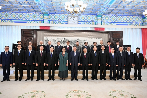 李强同赵汀阳(后排右六)等新聘任的国务院参事、中央文史研究馆馆员合影留念。图片来源:新华社