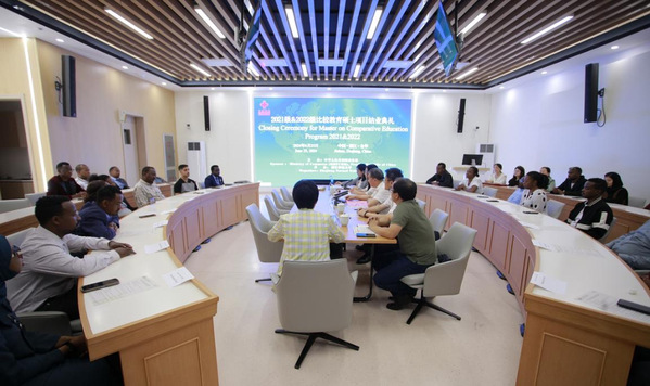 近日,2021级、2022级比较教育硕士项目(英文)结业典礼在浙江师范大学教师教育实训中心一楼会议室举行。此项目由商务部主办、浙江师范大学承办,来自亚非地区12个国家的28名学员参加典礼。浙江师范大学党委副书记傅关福出席。
