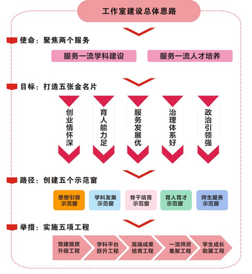 工作室坚持实施“党建提质升级工程”“学科平台跃升工程”“高端成果培育工程”“一流师资集聚工程”“学生成长助翼工程”等5项工程,创建“思想引领示范窗”“骨干培育示范窗”“学科发展示范窗”“育人育才示范窗”“师生服务示范窗”等5个示范窗,打造“政治引领强、治理体系好、服务发展优、育人能力足、创业情怀深”的党建“金名片”。助推数学学科获批博士点、博士后流动站、国家级“111计划”创新引智基地、2个国家一流专业建设点、1个省“十四五”首批基础学科拔尖学生培养基地,入列省高水平大学登峰学科,数学教师团队获评省首批高校黄大年式教师团队。