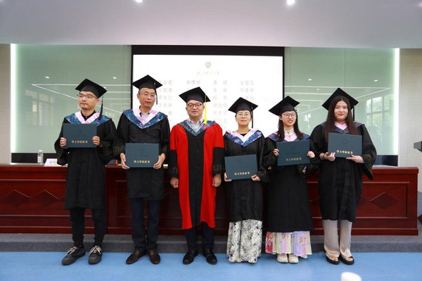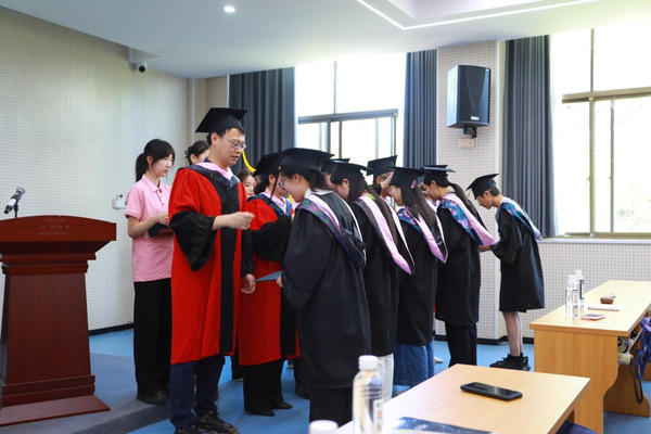 学位授予仪式上,李盛与毕业生合影留念,继续教育与合作办学管理处、终身教育学院、经济与管理学院、教师教育学院、儿童发展与教育学院导师代表为获取学位的毕业生颁发学位证书、拨穗正冠。