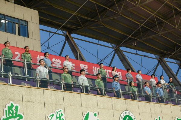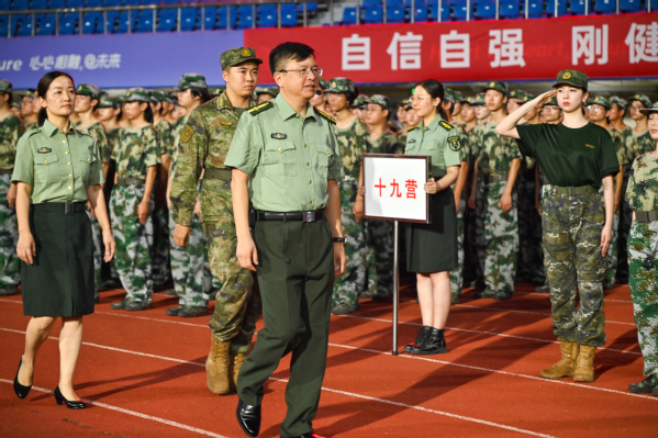 邱利民在军训旅有关负责人陪同下对各方阵进行检阅。同学们眼神坚定,身姿挺拔,以洪亮的口号回应邱校长的亲切问候。