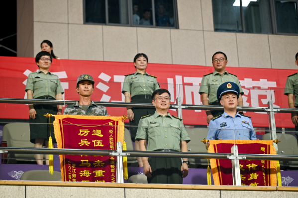 邱利民代表学校向长期以来关心和支持学校军训工作的中国人民解放军某部队表示衷心感谢,向全体教官和工作人员表示崇高敬意,向刻苦训练,圆满完成军训任务的全体学员表示祝贺。邱利民指出, 军事训练是同学们接受国防教育的基本形式,是国家和学校壮大国防力量、培养“四有”新人的重要方式。军训见证着浙师学子的蜕变与进步,在军训的交流中同学情、战友情、师生情变得更加深厚。邱利民相信,浙师学子所形成的军人般坚韧的意志,将持续助力大家在未来的人生旅途中砥砺奋进、勇毅前行。