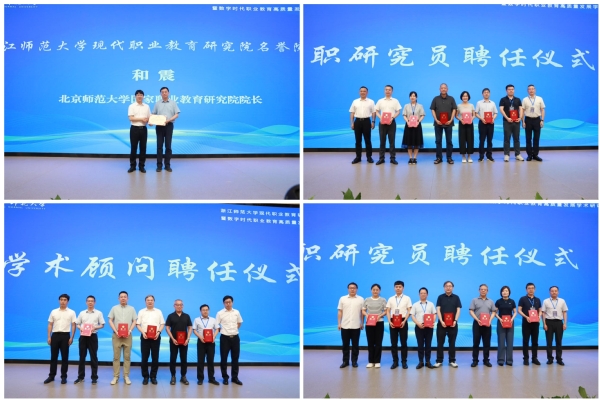 与会领导为“浙江师范大学现代职业教育研究院”揭牌,并为名誉院长、学术顾问、兼职研究员颁发聘书。