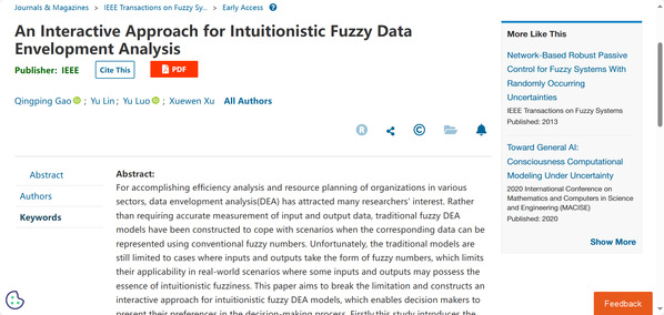 近日,浙江师范大学工学院高清平课题组在国际顶级期刊IEEE Transactions on Fuzzy Systems上在线发表研究论文,题目为An Interactive Approach for Intuitionistic Fuzzy Data Envelopment Analysis。该研究工作得到了中国国家留学基金、浙江省公益技术应用研究计划等项目资助。浙江师范大学高清平博士为第一作者和通讯作者,浙江师范大学为唯一通讯单位。