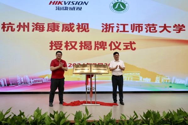 蒋云良和徐习明为海康威视产学研合作基地和浙师大学生创新实践基地授权揭牌。