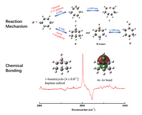 实验结果揭示了两种不同的反应途径,涉及硼原子活化环己烯的C=C键和C–H键。硼原子通过进攻环己烯C=C键,形成η2 (1,2)-BC6H10复合物和3,4,5,6-四氢硼哌啶自由基。此外,实验上也观察到硼原子进攻环己烯C–H键,形成1-硼三环[4.1.0.02,7]庚烷自由基和1-环己烯-1-硼自由基的产物。1-硼三环[4.1.0.02,7]庚烷自由基的成键分析结果表明,该自由基中存在离域的四中心单电子键。该研究不仅可以让我们更好地理解硼原子对环烯烃C–H和C–C键活化,而且对设计合成相应的硼杂环化合物、了解该类化合物的光化学行为具有重要的指导意义。
