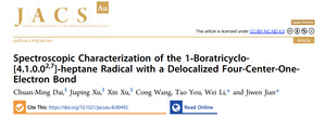 近日,浙江师范大学杭州高等研究院简继文课题组与华北电力大学李巍博士合作,在有机硼杂环自由基的光谱表征方面取得重要进展。相关研究成果以Spectroscopic characterization of the 1-boratricyclo[4.1.0.02,7] heptane radical with a delocalized four-center-one-electron bond为题,发表在国际期刊JACS Au上。其中,戴传铭、徐佳萍和徐昕为本论文的共同第一作者,李巍博士和简继文博士为本论文通讯作者,浙江师范大学为本论文第一完成单位。