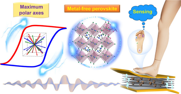 钙钛矿材料因其多功能性和优异性能而受到广泛关注,特别是在铁电性方面的应用。无金属钙钛矿因其轻量、低成本、高柔性和环保特性而成为研究热点。尽管研究人员在无金属钙钛矿铁电体上实现了显著的压电性、电卡效应及可调的矫顽场,但构建多极轴无金属钙钛矿铁电体依旧是科研人员面临的难题。