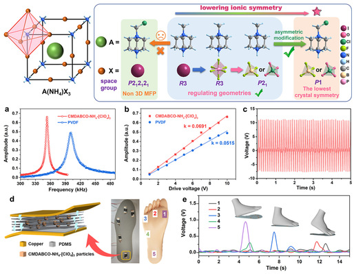 在熊仁根院士“铁电化学”理论的指引下,化学与材料科学学院分子铁电团队通过精准的结构设计,成功制备出一种具有最多极轴的无金属钙钛矿材料CMDABCO−NH4−X3(CMDABCO = Cl-甲基DACBO; X = [ClO4]−或[BF4]−)。得益于多极轴特性,CMDABCO−NH4−[ClO4]3的薄膜和复合压电器件表现出优异的能量转化性能。这一突破不仅显著提升了材料的铁电性能,还为柔性环保传感器件的开发提供了新的潜在材料。