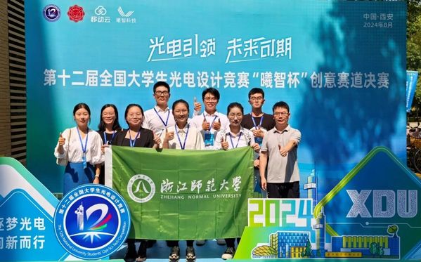 8月22日至24日,第十二届全国大学生光电设计竞赛决赛在西安电子科技大学举行,浙江师范大学物理与电子信息工程学院学生团队在决赛中获得一等奖1项,二等奖1项,三等奖2项,杨朝凤、刘雯两位老师获评第十二届全国大学生光电设计竞赛“优秀指导教师”。浙江师范大学已连续七届斩获该项赛事的全国决赛一等奖。
