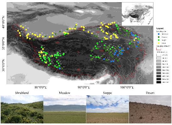 图3.研究点位分布图和孢粉丰富度和均匀度与环境因子的关系:Liao MN, Jin YL, Li K, Liu LN, Wang NN, Ni J*, Cao XY*. 2024. Modern pollen-plant diversity relationship in open landscapes of Tibetan Plateau. Palaeogeography, Palaeoclimatology, Palaeoecology, 641: 112131. https://doi.org/10.1016/j.palaeo.2024.112131
