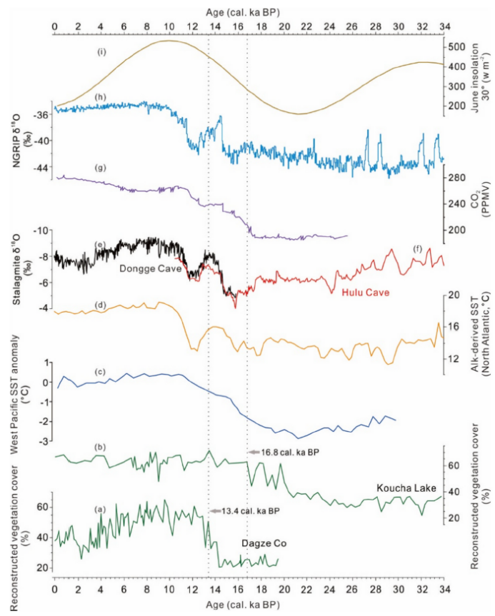 图1.青藏高原中部达则错、寇查湖植被覆盖重建与古气候记录的比较:Liu LN, Wang NN, Zhang YR, Liang J, Ni J, Cao XY*. 2024. Spatial and temporal variations of vegetation cover on the central and eastern Tibetan Plateau since the Last glacial period. Global and Planetary Change, 240: 104536. https://doi.org/10.1016/j.gloplacha.2024.104536