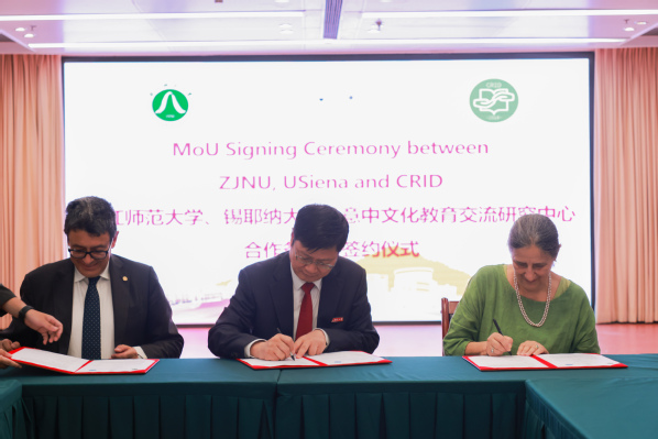 9月21日上午,意大利锡耶纳大学校长罗伯托·迪·皮特拉(Roberto Di Pietra)、意中文化教育交流研究中心主席、锡耶纳大学教授玛丽娅(Maria Omodeo)一行访问浙师大,并与学校签署三方合作谅解备忘录。校党委书记蒋云良出席两校合作座谈会暨签约仪式,副校长张建珍主持。