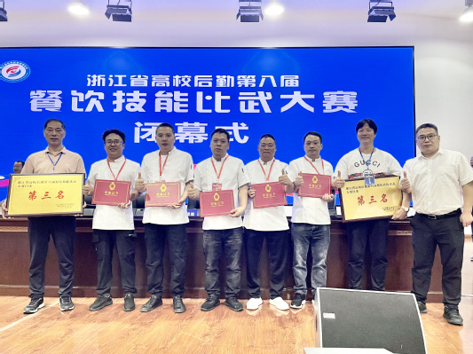 经过激烈角逐,浙师大代表队凭借过硬的专业技术和出色的赛场表现荣获佳绩。在白案和红案两个团体项目中均获得了第三名的好成绩,且白案和红案累加总分位居全省高校第一。此外,翁新伟同志荣获白案个人金奖,金燕军同志荣获红案个人金奖,杜绍光、陈志清、朱日旭同志则分别获得了白案和红案个人银牌。