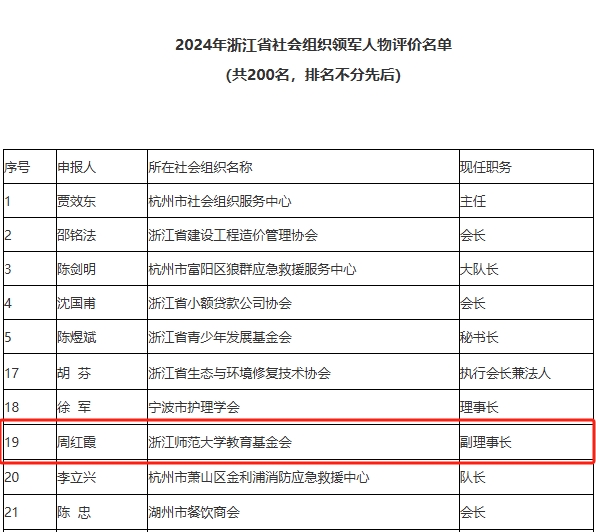 近日,浙江省民政厅通报了2024年浙江省社会组织品牌展示和领军人物评价名单。浙江师范大学发展联络办公室主任、教育基金会副理事长兼秘书长周红霞获评浙江省社会组织领军人物。