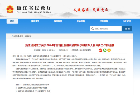 关于2024年浙江省社会组织品牌展示和领军人物评价工作的通报。图片来源 浙江省民政厅