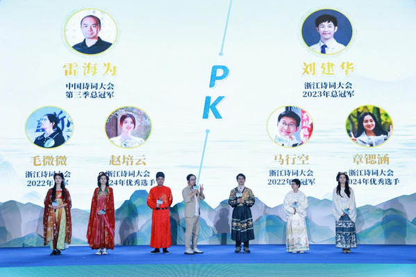 竞答表演赛环节特邀《中国诗词大会》第三季总冠军雷海为、“浙江诗词大会”2023年总冠军刘建华分别作为领队,带领“浙江诗词大会”历届优秀选手代表进行团队比拼,通过设置1v1比拼答题、选题追逐和本次活动首创的“湖州诗词飞行棋”等三轮环节,巧妙融合了展现中华之美的湖州文化元素,兼具趣味性、知识性和互动性。