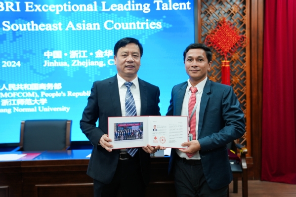 11月12日上午,东南亚国家“一带一路卓越领军人才”培训班结业仪式在浙江师范大学举行。浙江师范大学副校长朱毅峰出席并致辞。培训班由商务部主办、浙江师范大学承办,来自柬埔寨、马来西亚、老挝等东南亚国家的23名学员参加。