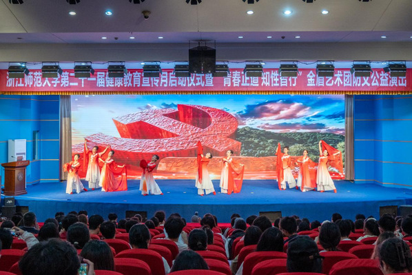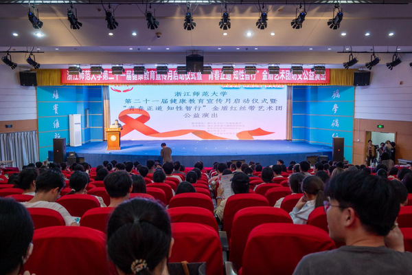 正值第37个“世界艾滋病日”来临之际,为贯彻落实《健康中国行动(2019-2030 年)》有关要求和党的二十大精神,普及艾滋病相关知识,提高全体师生防艾意识,11月14日,浙江师范大学第二十一届健康教育宣传月启动仪式暨“青春正道 知性智行”金盾艺术团防艾公益演出在大学生活动中心二楼报告厅举行。