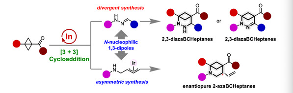 针对这一挑战,基于课题组在路易斯酸催化双环丁烷参与的偶极环加成反应的研究基础,本工作实现了In(OTf)3催化双环[1.1.0]丁烷与双氮杂1,3-偶极子腙的(3+3)环化反应,通过改变反应的保护气体(氮气或氧气),可以选择性地高效构建双氮杂双环[3.1.1]庚烷和双氮杂双环[3.1.1]庚烯这两种骨架。此外,新型氮杂烯丙基碳酸酯也被证明适用于该体系,在In(OTf)3和Ir的接力催化下,实现了手性2-氮杂双环[3.1.1]庚烷骨架的催化不对称构建。这一工作进一步丰富了杂原子双环[3.1.1]庚烷分子库,为药物分子修饰提供了丰富的合成砌块。
