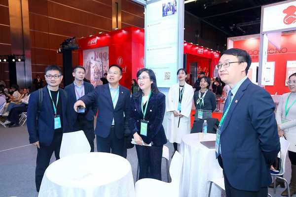 张建珍在HSK国际教育交流展浙师大展台看望参展师生代表。图片来源 国际处