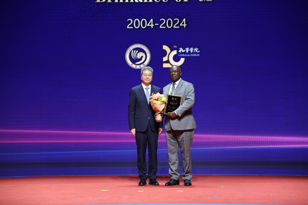 在“纪念孔子学院成立20周年”主题研讨会上,教育部副部长吴岩向浙师大孔子学院合作方、喀麦隆宪法委员会委员、原雅温得第二大学校长阿道夫·闵库阿·西教授授予“孔院之光”铭牌,表彰他担任雅温得第二大学孔子学院理事长期间的杰出贡献。