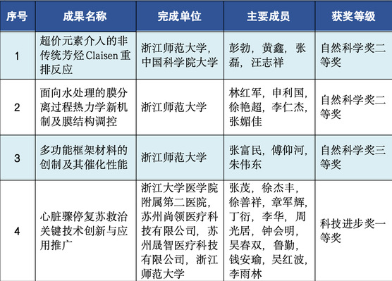 化学与材料科学学院彭勃教授团队主持与中国科学院大学共同完成的成果“超价元素介入的非传统芳烃Claisen重排反应”和地理与环境学院林红军教授团队主持完成的成果“面向水处理的膜分离过程热力学新机制及膜结构调控”均荣获2023年度浙江省自然科学奖二等奖。