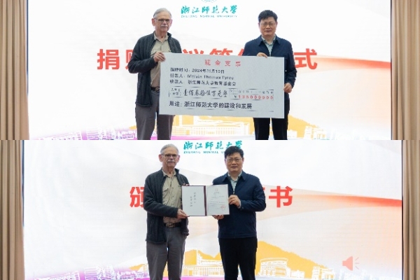 Tyree教授与浙江师范大学教育基金会签署捐赠协议,浙江师范大学向Tyree教授颁发捐赠证书。