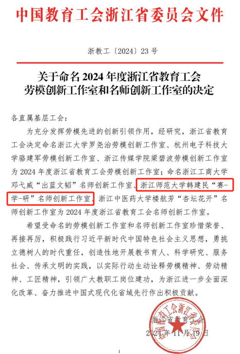 近日,浙江省教育工会发布了《关于命名2024年度浙江省教育工会劳模创新工作室和名师创新工作室的决定》,浙江师范大学韩建民“赛-学-研”创新工作室获命名第二批浙江省教育工会名师创新工作室(全省高校共3个)。