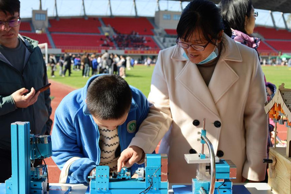 在比赛的同时,来自浙江师范大学物理与电子信息工程学院、金华市数字经济学会和人工智能协会等单位的科技展品争相在现场亮相,观众们在科普志愿者们生动形象地讲解下,近距离感受到了科技作品的组成部分,现场气氛热烈而又充满文化气息,在欣赏作品的同时,也在不断地交流着自己对科技作品的热爱与见解。活动期间同学们拿着各项目的体验券,感受不同科技产品的制作带来的新奇体验。