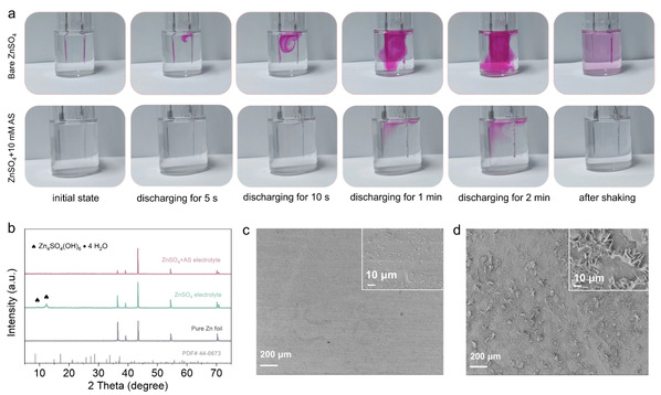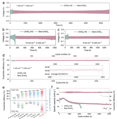 基于此,该工作引入了一种微量添加剂(10 mM,0.1wt%),琥珀酸铵,不仅能够调节锌离子的溶剂化结构,降低了水的活性,还能在电极/电解液界面形成了吸附层,抑制水的分解,诱导锌离子均匀地沉积。另外具有缓冲能力的NH4+ 维持了界面的pH稳定变化,抑制了电极表面的腐蚀以及副产物的生成。得益于该添加剂的多功能作用, Zn||Zn对称电池的累积容量达到了6150 mAh cm−2,同时Cu||Zn不对称电池在小电流1 mA−2实现了99.91% 的高库伦效率。