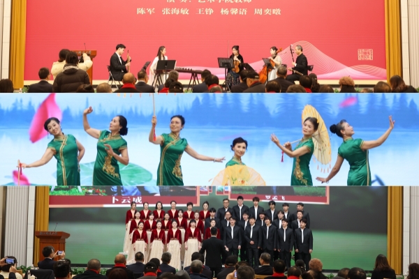 弦音流转,笛声悠扬。艺术学院教师们合力演奏的《敦煌新语》打通时空,一顿一扬间奏响敦煌千年古韵,将悠悠历史呈现在大家面前,赢得阵阵掌声;校教工合唱团演唱歌曲《回娘家》,曲调欢快,温暖人心,传达着对家乡的深沉爱意与对美好生活的热情赞美,此表演为2024年全省职工合唱比赛金奖作品;“银耀浙师”旗袍表演队带来节目《雨巷佳人》,悠悠乐曲声中,表演者们身着青绿色旗袍,宛若水中碧荷,温柔婉约,带给观众一场视觉盛宴。现场,校领导还为退休教职工颁发“致敬系列”荣休纪念品。此外,学校还为荣休教职工准备了手绘地图水晶摆件、荣休纪念册等礼物。
