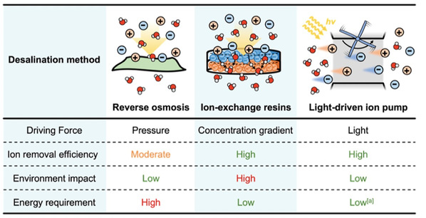 表1 反渗透、离子交换和光驱动离子泵三种海水淡化方法的比较。