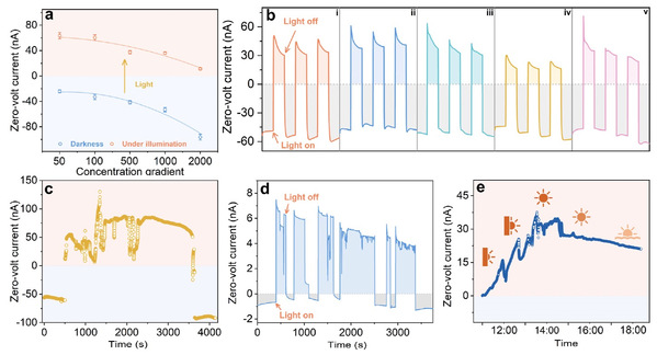 图2 离子泵性能评估。a) 50到2000倍KCl浓度梯度和光电流的关系,展示了离子泵在高达2000倍浓度梯度下有效输送离子的能力。b) 在400 mW cm⁻1氙灯下,COF-PyTa膜在1000倍盐浓度梯度(1 mM / 1 μM)下的光电流,(i) KCl、(ii) NaCl、(iii) MgCl2、(iv) CaCl2、(v) 四种盐的等摩尔混合物,灰色背景表示浓度梯度驱动扩散电流,彩色背景表示主动泵送离子的电流。c) 在自然光照射下,COF-PyTa膜的光电流,两侧为KCl溶液,浓度梯度为1000倍(1 mM / 1 μM)。d) 在自然光照射下,COF-PyTa膜的循环光电流,两侧为四种盐的等摩尔混合物,低浓度侧为0.1 μM(KCl、NaCl、MgCl2、CaCl2各0.025 μM),高浓度侧为2 μM(各0.5 μM)。灰色背景表示由扩散引起的被动电流,彩色背景表示由主动泵送离子所产生的电流。为验证膜的光响应可逆性,特意设定了不同光照与不光照的时间间隔。e) 在阳光照射下,使用经过初步反渗透处理、电导率为1.2 μS cm⁻1的水样测量COF-PyTa膜的光电流。