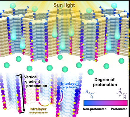 图1. 垂直质子化梯度的共价有机框架膜利用太阳能进行海水淡化示意图。