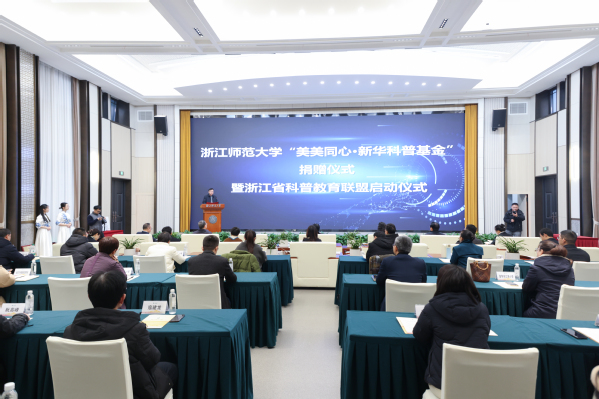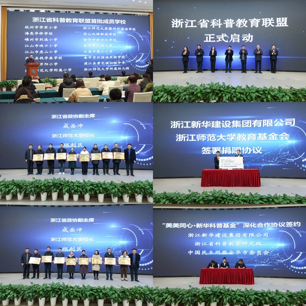 现场,浙江新华建设集团、浙江师范大学教育基金会代表签署捐赠协议,浙江新华建设集团、浙江科普教育研究院、民盟金华市委会代表签署“美美同心·新华科普基金”深化合作协议。李盛宣读了浙江省科普教育首批联盟学校名单。成岳冲、邱利民为联盟学校授牌,并与与会领导共同启动浙江科普教育联盟。