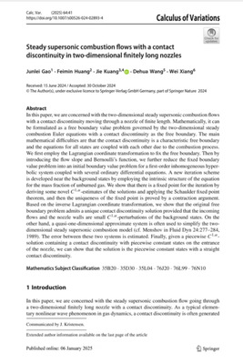 近日,数学科学学院高俊磊博士与中国科学院数学与系统科学研究院黄飞敏研究员、美国匹兹堡大学王德华教授、香港城市大学向伟副教授,以及中国科学院精密测量科学与技术创新研究院匡杰副教授合作完成的82页篇幅的论文Steady supersonic combustion flows with a contact discontinuity in two-dimensional finitely long nozzles在数学学科A*类期刊Calculus of Variations and Partial Differential Equations上正式发表,浙江师范大学作为该论文的第一完成单位。