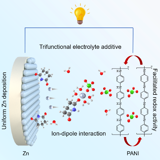 锌-有机电池由于安全性高和成本低,在当前储能系统中展现良好的应用前景。目前,有机正极的低容量密度以及锌负极存在的枝晶和析氢问题,严重影响电池的能量密度和循环寿命。为了应对这一问题,戊二酰亚胺(Glu)作为一种三功能电解质添加剂被提出,其可以同步调控锌离子溶剂化结构,提升镀锌/剥离循环稳定性以及促进聚苯胺(PANI)正极的氧化还原活性。实验测试和理论模拟表明,向Zn(ClO4)2中加入Glu分子可以通过离子-偶极相互作用的调节影响锌离子的溶剂化结构,促进脱溶过程。同时,Glu分子在锌负极表面可优先吸附,能够引导锌离子沿着具有较低表面能的(002)晶面均匀沉积,抑制锌枝晶生长。此外,Glu分子与Zn(ClO4)2协同形成固体电解质界面(SEI)层,有效规避副反应。基于优化的溶剂化结构和锌沉积行为,含Glu电解质的对称电池获得了优异的循环寿命,即使在高达85.2%的放电深度下也能保持138小时。此外,Glu分子可以重新调配水合锌离子的电荷分布,有效解离ClO4–阴离子,从而增强PANI正极在充放电过程中的氧化还原活性,使得Zn//PANI全电池展现出长循环寿命,即在1000次循环后,电池容量保持率仍高达91.0%。这项研究工作为开发新型高效电解质并改善Zn//PANI电池的双界面化学提供理论指导。