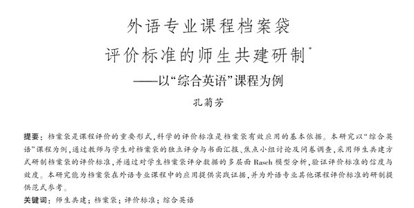 近日,浙江师范大学外国语学院英语系副教授孔菊芳在《外语界》发表题为《外语专业课程档案袋评价标准的师生共建研制——以“综合英语”课程为例》的学术文章。