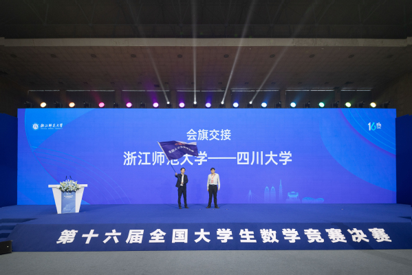 现场,中国数学会青年工作与大学生数学竞赛委员会副主任孙笑涛宣布了下一届竞赛承办单位。四川大学数学学院与浙江师范大学数学科学学院负责人交接赛旗。