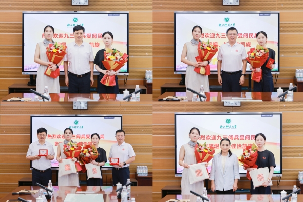 校领导向两位同学赠送鲜花和浙师70周年专属纪念品等,表达由衷祝贺与关怀。张婉煜、杜佳怡也将珍贵的中国人民抗日战争暨世界反法西斯战争胜利80周年纪念章回赠学校,让这份国家荣光永久珍藏于浙师校园,激励后人。