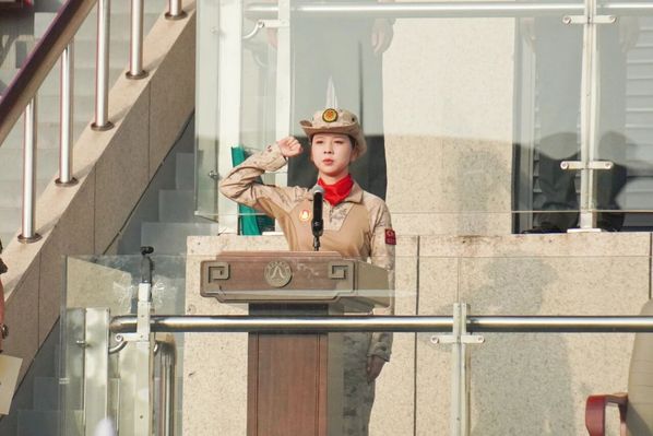 九三阅兵受阅学子张婉煜带领金华校区全体参训人员宣誓。浙师大融媒体中心 张柏钰 摄