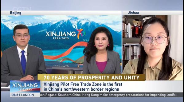 9月24日,浙江师范大学边疆研究院王子烨博士应中国国际电视台(CGTN)《环球瞭望》(“Global Watch”)栏目邀请,以直播连线方式接受访谈,就新疆对外开放、自由贸易试验区等议题进行深入交流。