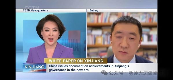 9月19日,浙江师范大学边疆研究院副院长王江应中国国际电视台(CGTN)《中国24》(“China 24”)栏目邀请,以直播连线方式接受访谈,对国务院新闻办公室当日发布的《新时代党的治疆方略的成功实践》白皮书进行解读。