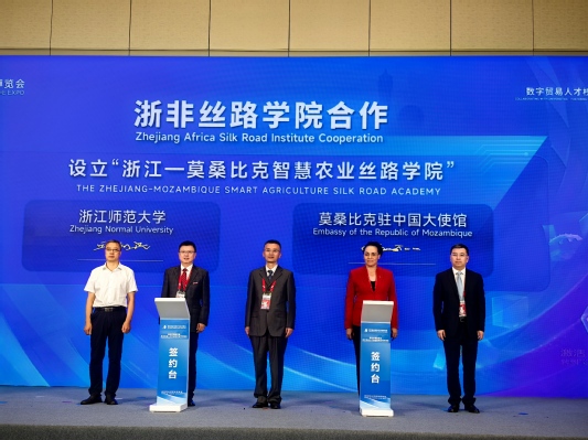 在数字贸易人才校企国际合作对接会上,浙师大校长邱利民代表学校签署两项对非合作项目。莫桑比克驻华大使玛丽亚·古斯塔瓦等嘉宾出席签约仪式。此次签约的“浙江-莫桑比克智慧农业丝路学院”项目,将重点支持“中国-莫桑比克智慧农业‘一带一路’联合实验室”平台的建设,聚焦智慧农业、节水灌溉、智能农机等关键技术领域,通过系统性培训、技术转移与标准输出,为莫桑比克培养复合型农业技术人才,推广耐旱水稻种植,并带动浙江农机装备出口,实现教育链、产业链与创新链深度融合。莫桑比克驻华大使玛丽亚·古斯塔瓦和省商务厅、教育厅及人社厅等领导出席签约仪式。