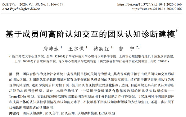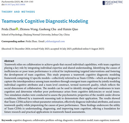 近日,浙江师范大学心理学院詹沛达课题组连续在国际心理测量顶级期刊 Psychometrika 和国内心理学顶级期刊《心理学报》发表两项重要研究成果,提出并验证了适用于团队合作场景的认知诊断模型,为精准识别团队合作中的“病灶”提供了科学方法。Psychometrika(1936年创刊)作为国际心理测量学顶级期刊,以发表 Cronbach's alpha 等里程碑成果引领全球测量方法创新;《心理学报》(1956年创刊)为中国心理学最权威期刊,持续推动本土基础与应用研究发展。