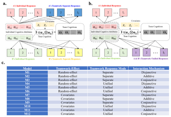 发表在 Psychometrika 上的文章创新性地提出了团队认知诊断建模框架。这些模型的核心突破在于同时建模个体认知属性与团队层面的"合作质量":一方面诊断每位成员对特定知识点的掌握情况,另一方面引入"团队合作效应参数"反映团队合作质量。模型还考虑了三种不同的认知交互机制:析取式(只要一人掌握,团队就可能受益)、合取式(必须两人都掌握才能形成有效团队认知)和加和式(掌握人数越多,团队认知越强)。通过组合不同作答模式、认知交互机制和协变量,构建了12种模型,灵活适配多样化合作场景。